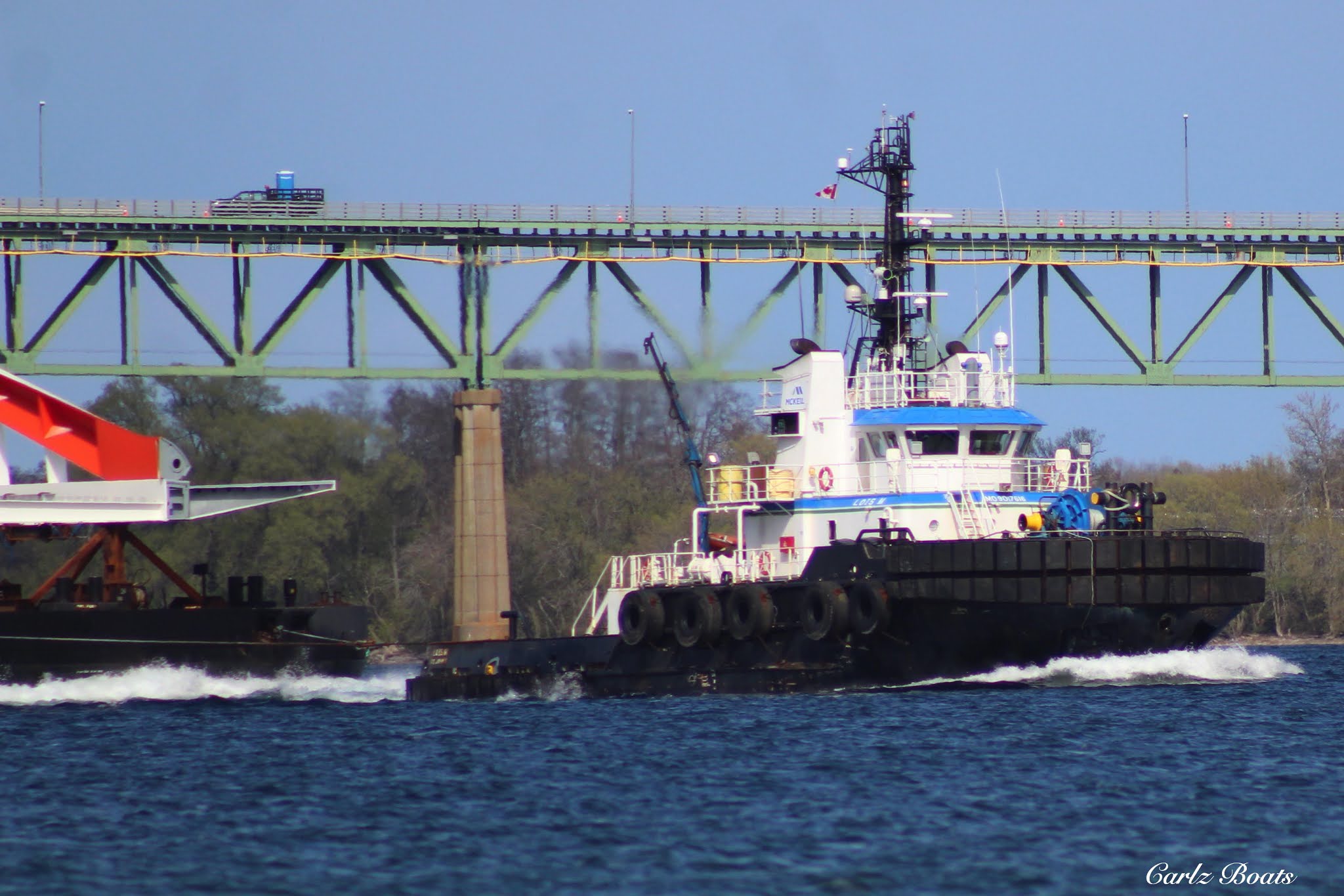 Bridges are built to cross "OVER" things like rivers, so you can appreciate the wonderment when I got to see one on May 10th being transported "ON" a river and also passing "BENEATH" one of the tallest and longest suspension bridges on the St. Lawrence Seaway, the Ogdensburg-Prescott International Bridge. While it doesn't happen everyday, it was just a little more than 6 months earlier when the first of 4 bridges, then the Cherry Street North Bridge was also hauled to Toronto from Nova Scotia on the McKeil Marine barge GLOVERTOWN SPIRIT while lead by their strong tractor tug LOIS M as well.