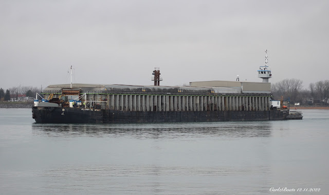 Accidents happen and deliveries sometimes get delayed but since the ALOUETTE SPIRIT made her maiden voyage in 2004, more than 1,500,000 tonnes of aluminum ingots and sows have been shipped to many destinations. Whether she's carrying Quebec-made aluminum ingots to Oswego or steel slabs from Hamilton to Cleveland, her hydraulic bow ramp as seen in ship watching friend, Helen Mott's photo above, makes it easy to "ro/ro" (roll on/roll off) cargoes from dockside forklifts. When taking on grain which the ALOUETTE SPIRIT has been known to do at the Port Colborne Grain Terminal, the barge's retractable roof panels keeps the cargos dry for their transit.